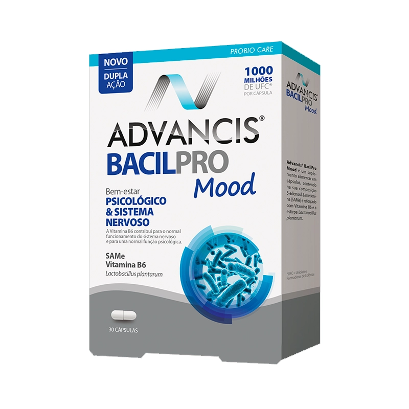 Advancis BacilPro Mood é um suplemento alimentar que contribui para o normal funcionamento do sistema nervoso e para uma normal função psicológica e contribui para o normal metabolismo produtos de energia e para a redução do cansaço e da fadiga.