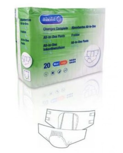 Alvita Fralda Incontinência Maxi Large 20 unidades, com as melhores cacterísticas, elevada capacidade de absorção, respiráveis, hipoalergénicos, neutralizadores de odor, sem látex e discretos.