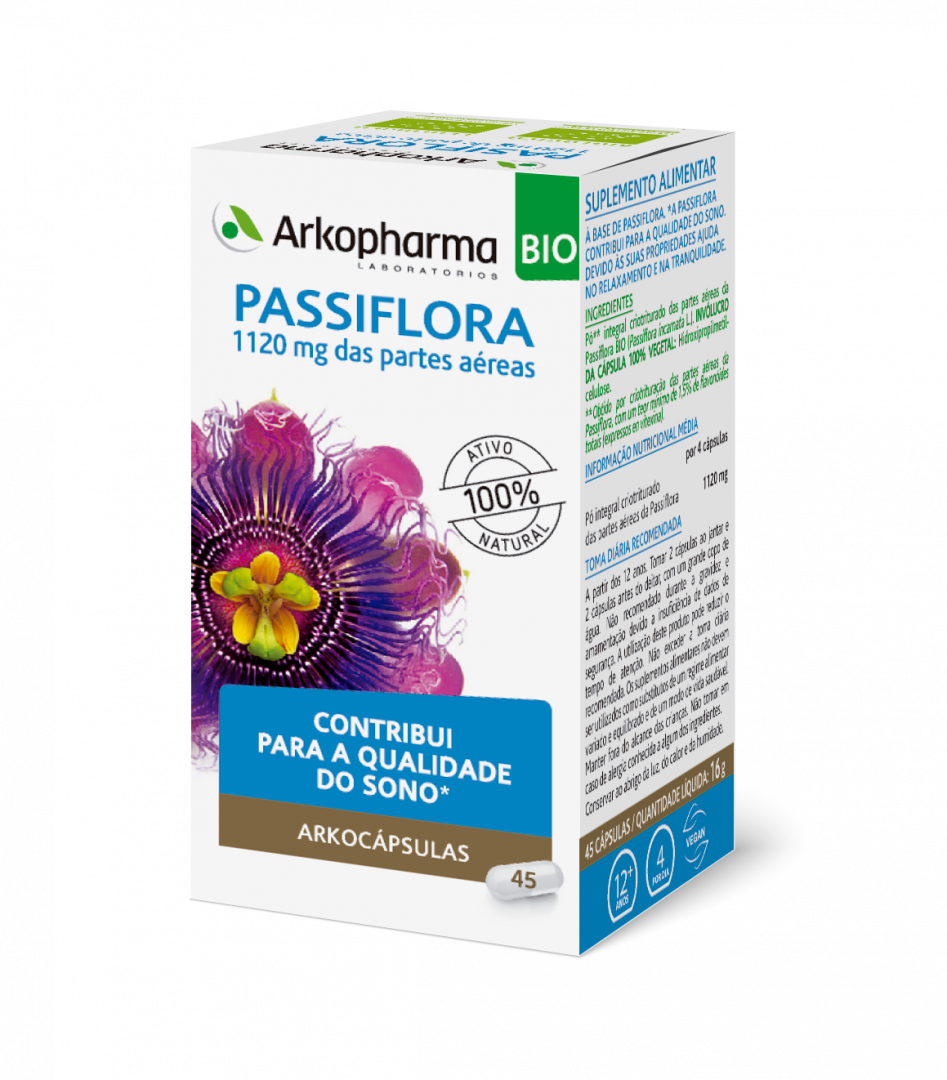 ARKOCÁPSULAS Passiflora é um suplemento alimentar à base de Passiflora. A Passiflora contribui para a qualidade do sono. Devido às suas propriedades ajuda no relaxamento e na tranquilidade.