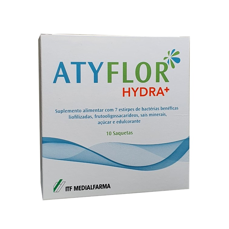 Atyflor Hydra+ Saq X10Atyflor Hydra+ 10 Saquetas, contém um mistura solúvel de 7 estirpes de bactérias benéficas liofilixadas, frutooligossacarideos, sais minerais , açucar e edulcorante . Estas bactérias benéficas ajudam a restabelecer a microflora intestinal, podendo ser tomado em todas as etapas, desde a lactação à idade adulta.