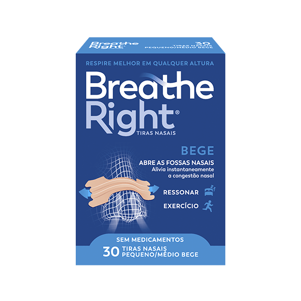 Tiras Nasais Rhinomer by Breathe Right. Abre as fossas nasais. Permite um alívio instantâneo da congestão nasal. Sem medicamentos. Ao abrirem as fossas nasais, as tiras nasais Rhinomer by Breathe Right melhoram o fluxo de ar, permitindo um alívio instantâneo da congestão nasal. As tiras nasais Rhinomer by Breathe Right não contêm medicamentos e está clinicamente comprovado que ao abrirem as fossas nasais permitem respirar 31% mais de ar. As tiras Rhinomer by Breathe Right são duas bandas plásticas flexíveis patenteadas. O adesivo especial permite que a tira se ajuste comodamente sobre as abas do nariz e a sua ação de flexão permite que as bandas elevem as fossas nasais abrindo e mantendo os canais nasais abertos. As tiras Rhinomer by Breathe Right podem ser usadas de dia ou à noite para o alívio de congestão nasal, devido a alergias, constipações, ressonar, ou desvio do septo, mas não devem ser usadas mais de 12h por dia.