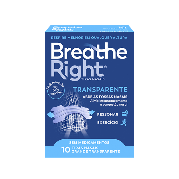Tiras Nasais Rhinomer by Breathe Right. Abre as fossas nasais. Permite um alívio instantâneo da congestão nasal. Sem medicamentos. Ao abrirem as fossas nasais, as tiras nasais Rhinomer by Breathe Right melhoram o fluxo de ar, permitindo um alívio instantâneo da congestão nasal. As tiras nasais Rhinomer by Breathe Right não contêm medicamentos e está clinicamente comprovado que ao abrirem as fossas nasais permitem respirar 31% mais de ar. As tiras Rhinomer by Breathe Right são duas bandas plásticas flexíveis patenteadas. O adesivo especial permite que a tira se ajuste comodamente sobre as abas do nariz e a sua ação de flexão permite que as bandas elevem as fossas nasais abrindo e mantendo os canais nasais abertos. As tiras Rhinomer by Breathe Right podem ser usadas de dia ou à noite para o alívio de congestão nasal, devido a alergias, constipações, ressonar, ou desvio do septo, mas não devem ser usadas mais de 12h por dia.
