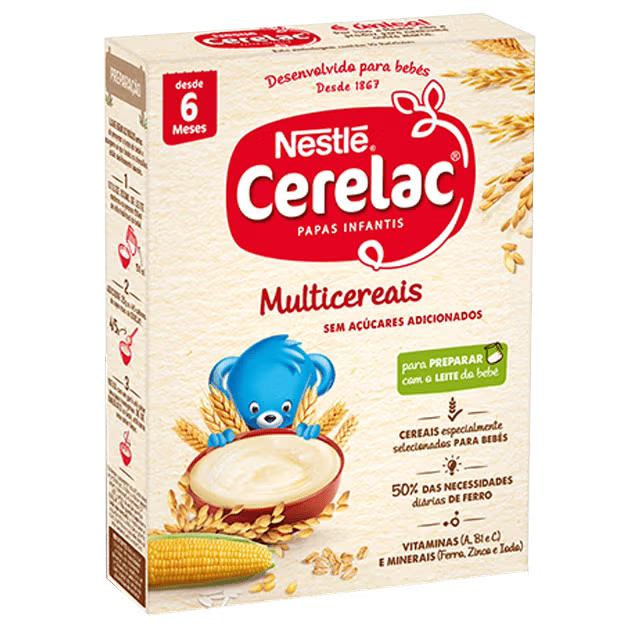 CERELAC Multicereais, sem açúcares adicionados, contém cereais integrais, que aportam toda a riqueza nutricional do cereal. É uma papa infantil de cereais com glúten, para preparar com leite, que apresenta um valor nutricional adequado para bebés a partir dos 6 meses.
