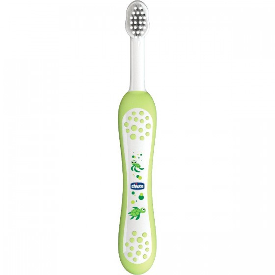 A cabeça moldada e pescoço fino foram especificamente estudados para a boca pequena do bebé. As cerdas são cónicas, ultra-macias e compridas para limpar delicadamente as gengivas e os dentinhos. A pega é ergonómica e anti-deslizante, o que permite que a escova seja utilizada tanto por um adulto como pelo bebé. Finalmente, as escovas são decoradas com divertidos animais, tornando este novo hábito de higiene ainda mais divertido. Com tampa de proteção.