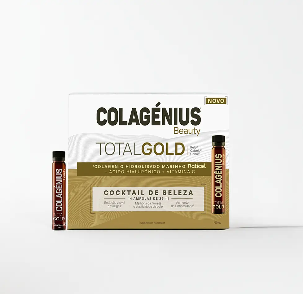 Cocktail de beleza com colagénio marinho hidrolisado Naticol®, ácido hialurónico e vitaminas C, E, A e zinco.