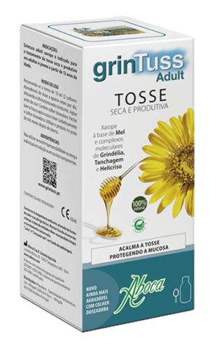 Grintuss é um produto à base de mel e complexos moleculares que realiza uma ação protetora e consequentemente lenitiva das vias respiratórias superiores. Atua sobre a tosse seca combatendo a irritação da mucosa e sobre a tosse produtiva favorecendo a hidratação e a eliminação do muco. Grintuss é um produto com ingredientes de agricultura biológica, sem glúten e com um sabor agradável.