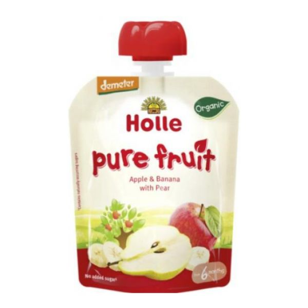 O smoothie de maçã, pera e banana de Holle é uma alternativa ao lanche ou sobremesa, com uma textura semelhante à das papas. Contém uma agradável combinação de sabores muito fácil de comer.