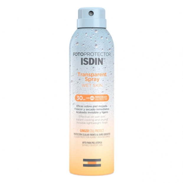 Fotoprotector ISDIN Transparent Spray Wet Skin SPF 30 é um protetor solar em spray, transparente e refrescante, especificamente desenvolvido para ser aplicado tanto em pele molhada como em pele seca.