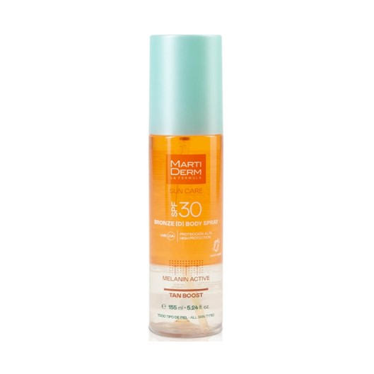 Martiderm Sun Care Bronze Spray SPF30 155 ml, solução bifásica de rápida absorção. Potencia e prolonga o bronzeado, ativando as defesas naturais da pele para obter um resultado radiante e uniforme.