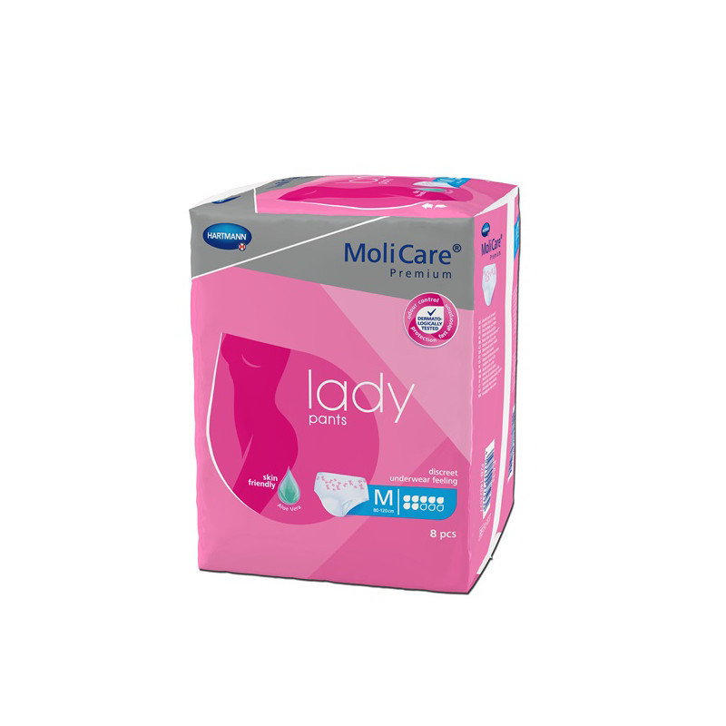 Molicare Lady Pants M 5 Gotas x8 é uma cueca absorvente anatómica que proporciona proteção e conforto, como se estivesse a usar roupa interior.