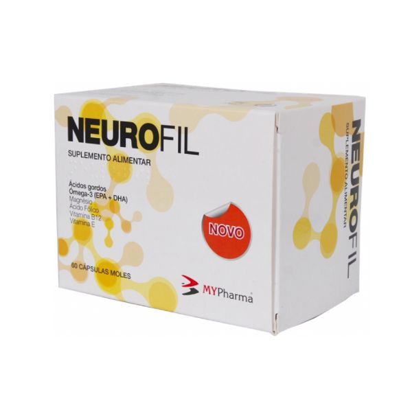 Neurofil 60 Cápsulas suplemento alimentar formulado com ácidos gordos ómega-3 (EPA + DHA), magnésio, ácido fólico, vitamina B12 e vitamina E.