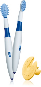 O conjunto de Escovas de Treino NUK introduz o seu filho no hábito regular da limpeza dos dentes passo-a-passo. A Escova de Treino massaja gentilmente áreas específicas do palato e das gengivas para aliviar a pressão dos dentes. A Escova de Limpeza NUK limpa gentilmente os primeiros dentes de forma suave, com os seus relevos em borracha resistentes às dentadas. O seu filho irá aprender o movimento correto de escovagem dos dentes quase sem reparar. Ambas as escovas têm um formato ergonómico anti-derrapante e parecem-se com escovas de dentes normais. Incluído no conjunto está um anel de proteção evitando que a escova entre demasiado na boca do bebé e que serve igualmente como apoio da escova quando pousada. O bebé adquire passo-a-passo o hábito regular de limpeza dos seus dentes.