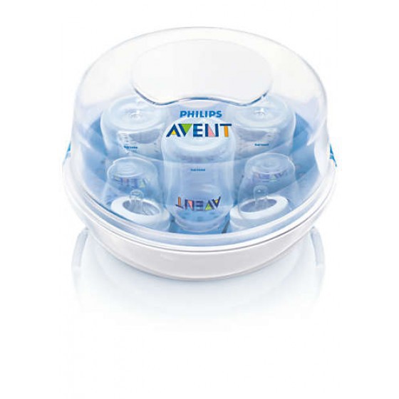 Esterilização por método a vapor para microondas com capacidade para 4 biberões de 260ml da Philips Avent, 2 bombas tira leite Philips Avent ou 2 biberões de 260ml Philips Avent.