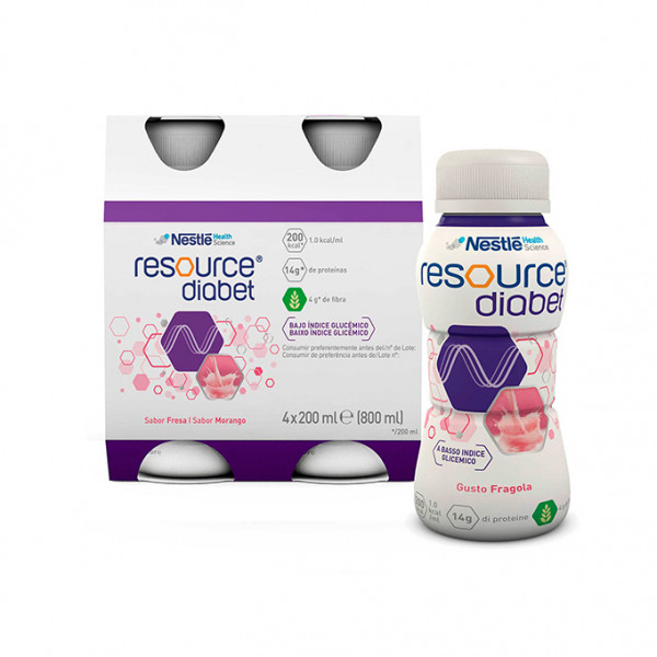 Resource Diabet Morango é adequado como fonte alimentar única.Dieta completa hiperproteica e com fibras.Com açúcar (isomaltulose) e edulcorante.Via oral e sonda.