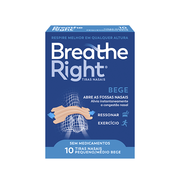 Tiras Nasais Rhinomer by Breathe Right. Abre as fossas nasais. Permite um alívio instantâneo da congestão nasal. Sem medicamentos. Ao abrirem as fossas nasais, as tiras nasais Rhinomer by Breathe Right melhoram o fluxo de ar, permitindo um alívio instantâneo da congestão nasal. As tiras nasais Rhinomer by Breathe Right não contêm medicamentos e está clinicamente comprovado que ao abrirem as fossas nasais permitem respirar 31% mais de ar. As tiras Rhinomer by Breathe Right são duas bandas plásticas flexíveis patenteadas. O adesivo especial permite que a tira se ajuste comodamente sobre as abas do nariz e a sua ação de flexão permite que as bandas elevem as fossas nasais abrindo e mantendo os canais nasais abertos. As tiras Rhinomer by Breathe Right podem ser usadas de dia ou à noite para o alívio de congestão nasal, devido a alergias, constipações, ressonar, ou desvio do septo, mas não devem ser usadas mais de 12h por dia.
