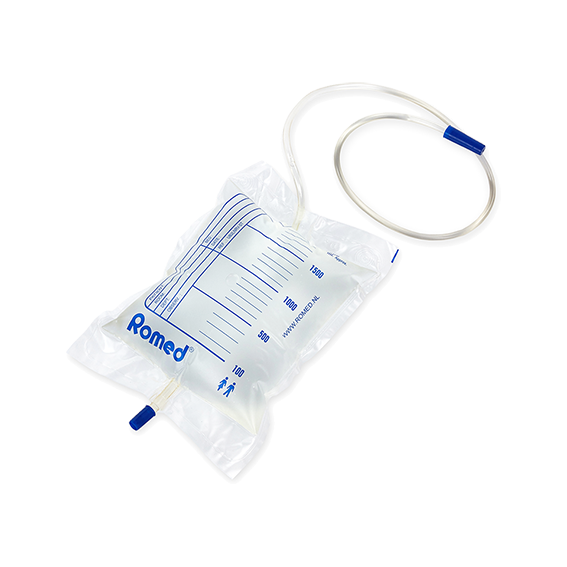 Sacos de urina com válvula anti-retorno e dispositivo de saída em cruz esterilizados com capacidade de 2 L.