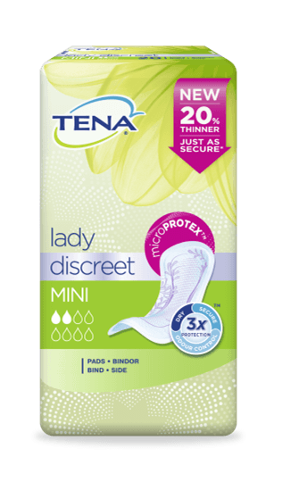 Tena Lady Discreet Penso Mini apresenta o mesmo tamanho que um pequeno penso higiénico mas foi desenhado para perdas de urina ligeiras.