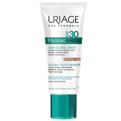 HYSEAC Cuidado Global SPF30 com cor é um produto "tudo-em-um" que ajuda a eliminar manchas (borbulhas, pontos negros) e a limitar o aparecimento de marcas de pele relacionadas com o sol. Protege a pele dos raios UVA, UVB e dos radicais livres, ao mesmo tempo que uniformiza o tom da pele. Com ingredientes dermatológicos chave como os AHA e o Ácido Salicílico, este cuidado refina a textura da pele e ajuda a reduzir as imperfeições da pele oleosa e com tendência acneica. A textura é leve, com um acabamento matificante e não oleoso. Testado dermatologicamente em pele com tendência a manchas. Não comedogénico.