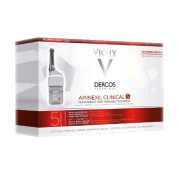 VICHY Dercos Aminexil Clinical 5 - Mulher é um cuidado antiqueda multiativo intensivo, para mulheres com queda de cabelo. Uma fórmula concebida para atuar nas 5 causas de queda de cabelo, com: