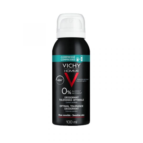 Vichy Homme Desodorizante Spray Hipoalergénico 48h Tolerância Óptima hipoalergénico e adequado a pele sensível num formato comprimido.